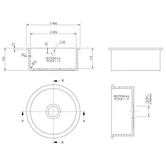 Inset Round Single Bowl with Overflow & Central Waste 460mm x 191mm