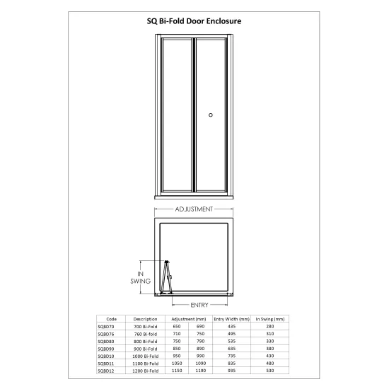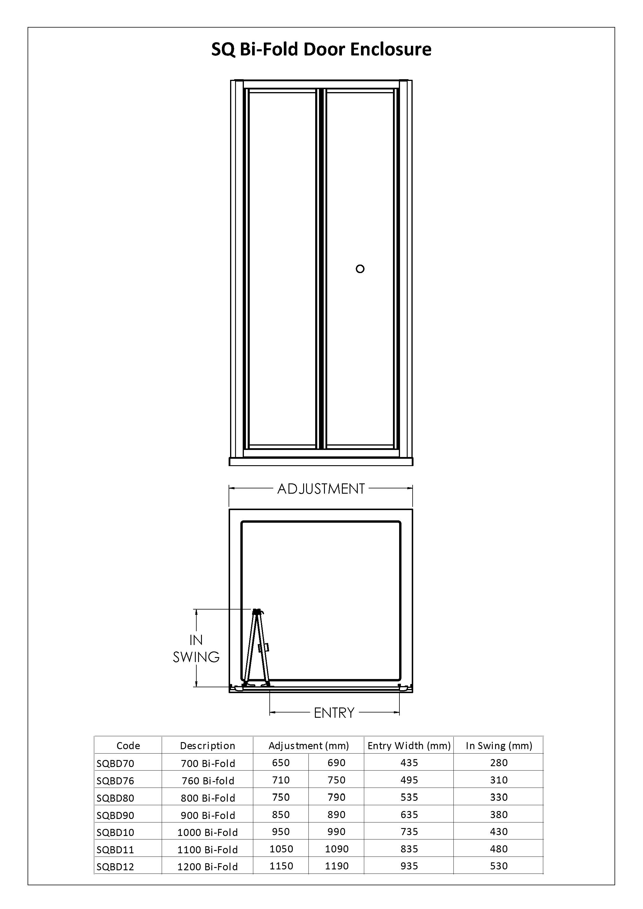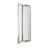 Chrome frame. Reversible Bi-Fold door opens inwards to save space. 5mm toughened safety glass. Shower tray sold separately. Suitable for use within a recess, or with a side panel to make an enclosure. Square D-bar handles. All enclosures are back by a lifetime guarantee.