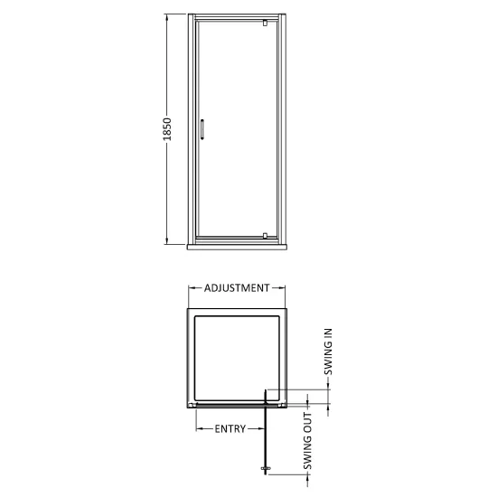 Chrome frame. Outward opening pivot door for easy access. 5mm toughened safety glass. Shower tray sold separately. Suitable for use with side panels or within a recess. Square D handle. Maximum adjustments will be reduced by 20mm if fitted with a side panel. All enclosures are backed by a lifetime guarantee.