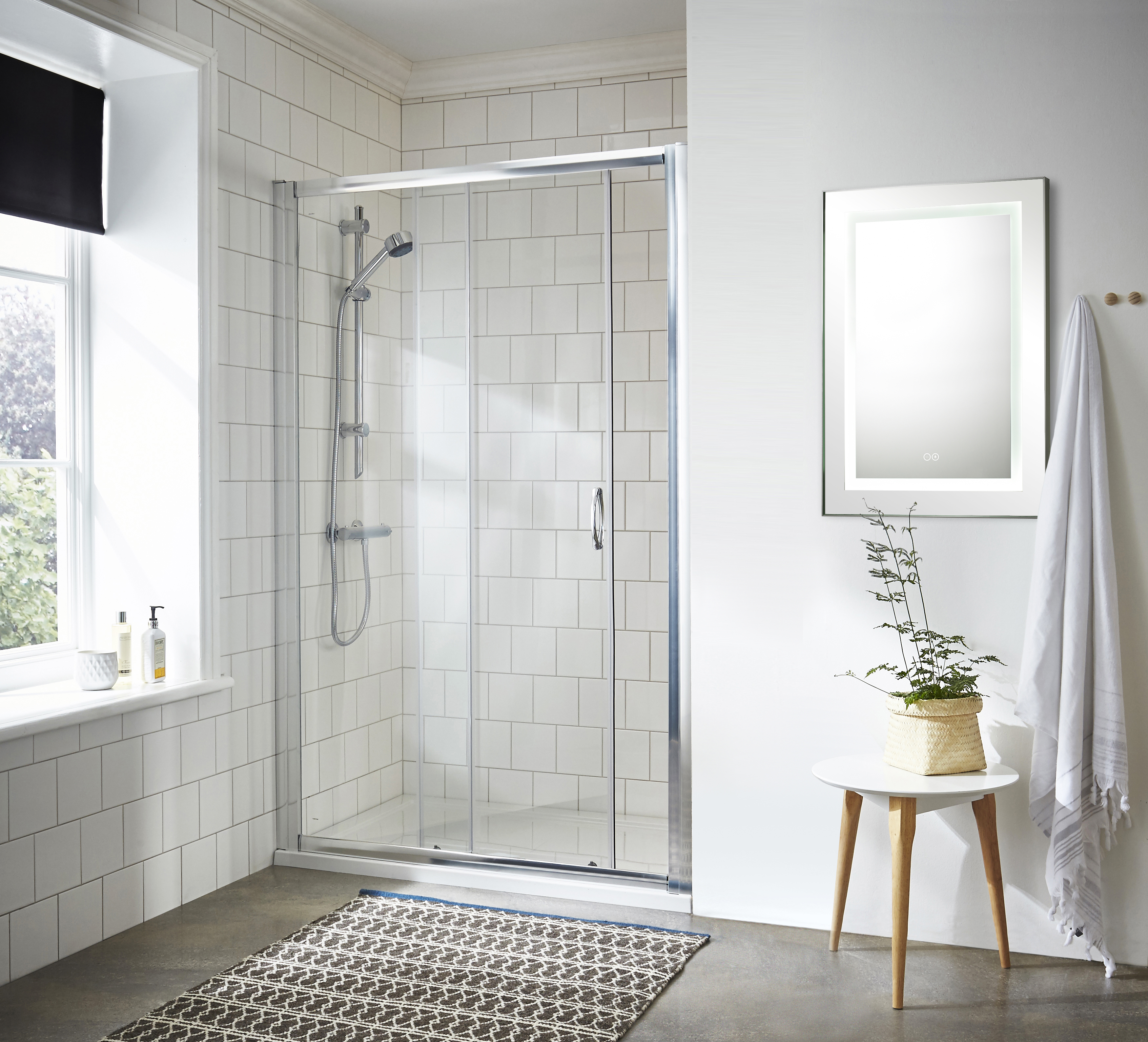 Patented Easyfit profile assembly system. Chrome frame. Sliding door for easy access. 5mm toughened safety glass. Quick release wheels for easy clean. Shower tray sold separately. Suitable for use with side panels or within a recess. Maximum adjustments will be reduced by 20mm if fitted with a side panel. Classic bow handle. All enclosures are backed by a lifetime guarantee.