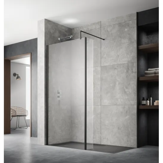 nuie 760mm Wetroom Screen With Support Bar - 8mm Glass - Matt Black