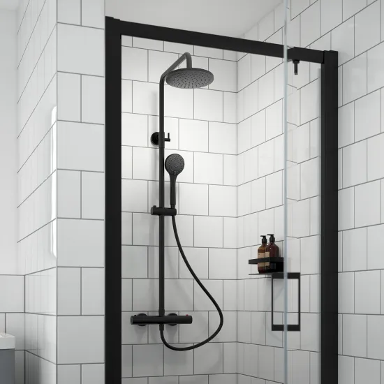 The perfect solution to multi-option showering. Thermostatically controlled. Round shower head. Round handset. Thermostatic control to +/- 2 degrees even if the water pressure fluctuates. Full thermal protection to prevent scalding in the event of hot or cold water shut off. In the event of hot or cold water failure the valve will shut down as per the relevant standard. Suitable for high pressure water systems. Suitable for unvented mains pressure systems. Suitable for shower pumps. Manufactured from high quality brass & ABS with luxury matt black finish.