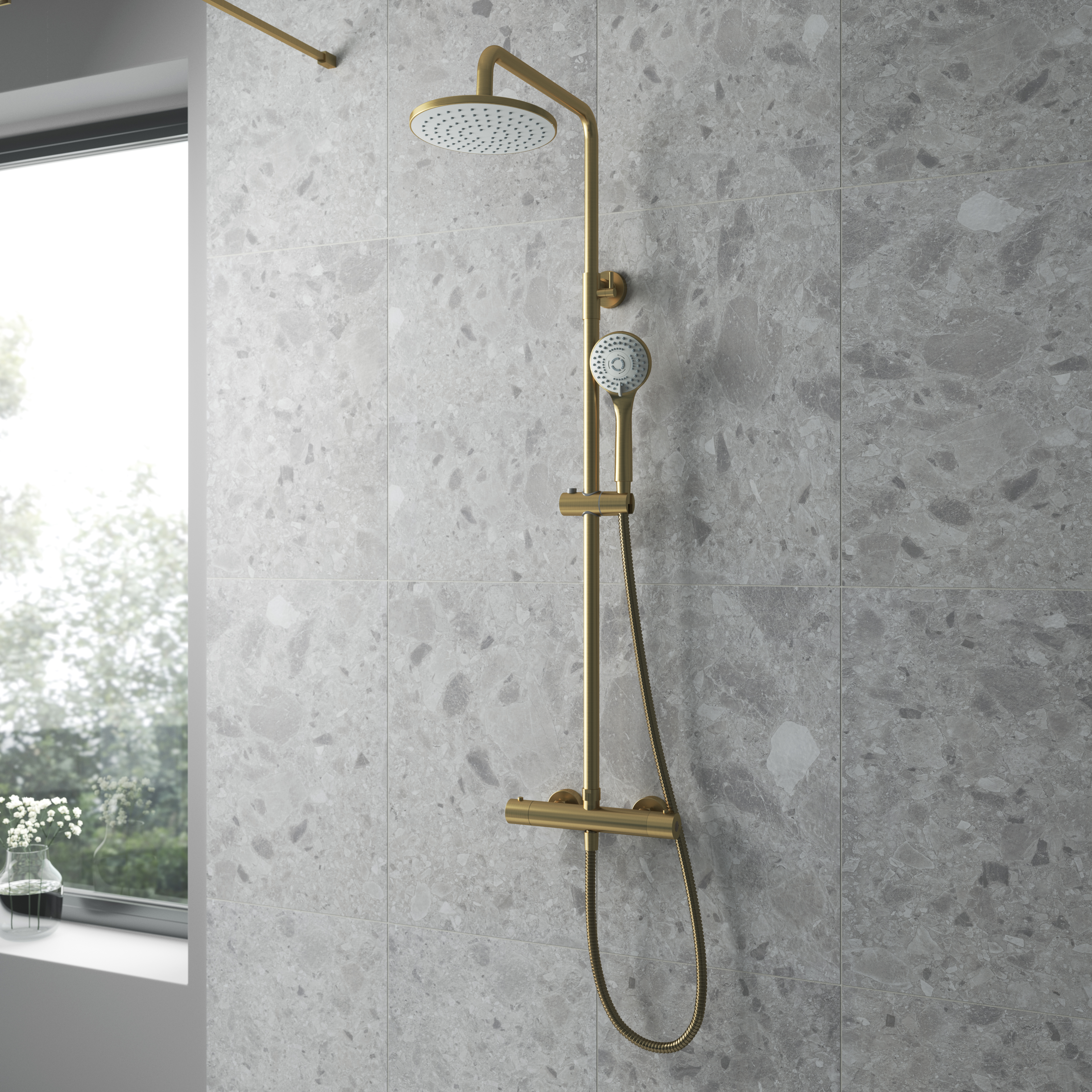 The perfect solution to multi-option showering. Thermostatically controlled. Round shower head. Round handset. Thermostatic control to +/- 2 degrees even if the water pressure fluctuates. Full thermal protection to prevent scalding in the event of hot or cold water shut off. In the event of hot or cold water failure the valve will shut down as per the relevant standard. Suitable for high pressure water systems. Suitable for unvented mains pressure systems. Suitable for shower pumps. Manufactured from high quality brass & ABS with luxury brushed brass finish.
