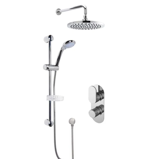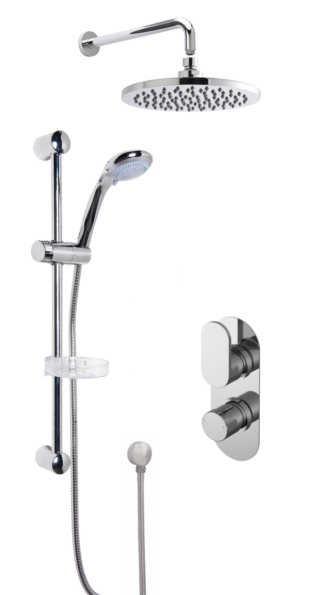 Binsey Thermostatic Concealed Twin Round Valve with Diverter, Slide Rail Kit with Multi Function Handset & Outlet Elbow Wall Mount Shower Arm & Round Fixed Head Shower Kit