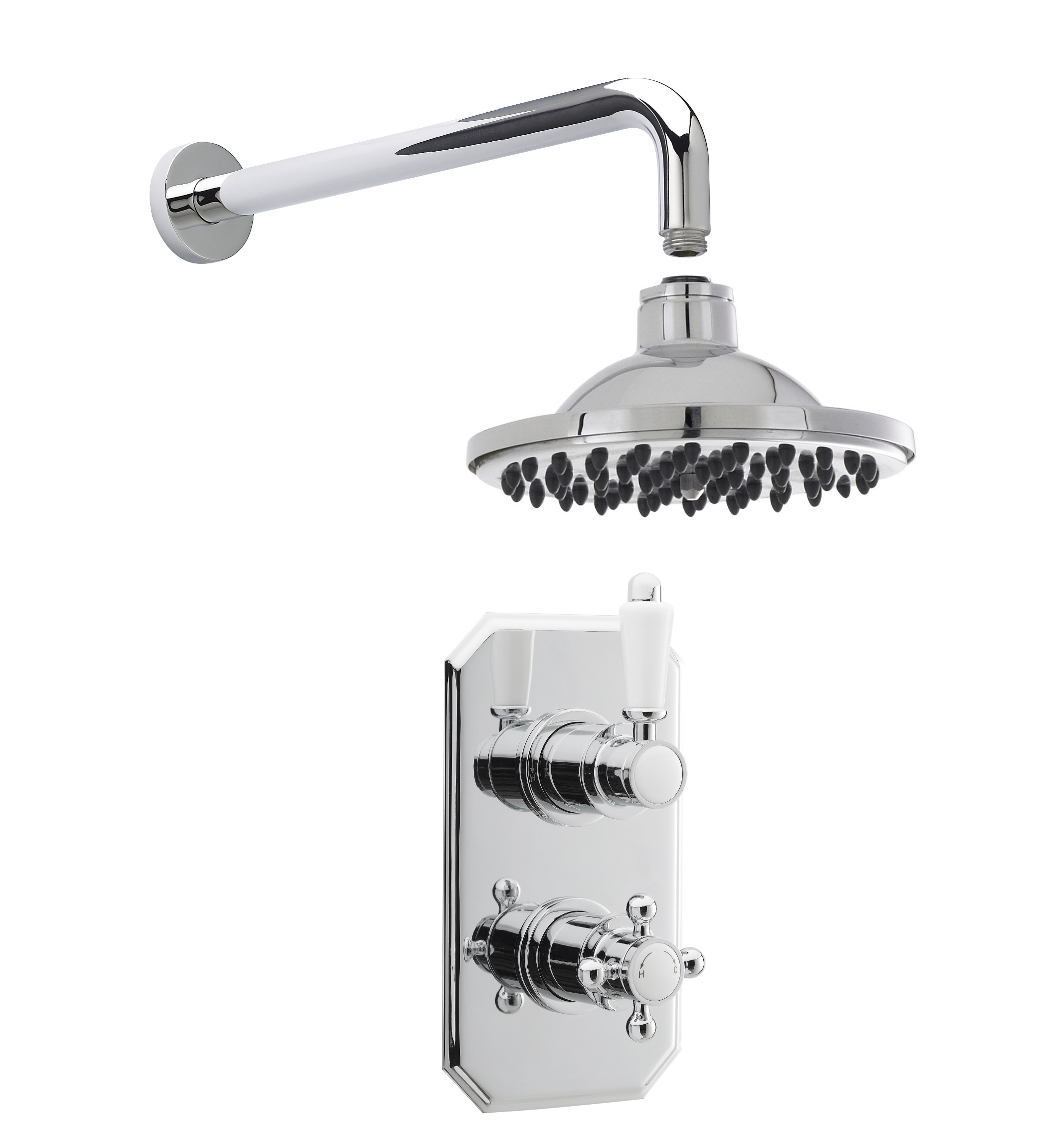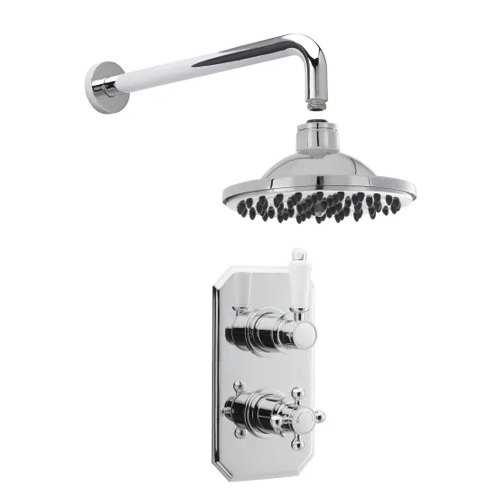 nuie Victorian Traditional Thermostatic Concealed Twin Valve, Wall Mount Shower Arm and Round Fixed Head Shower Kit - Chrome/White