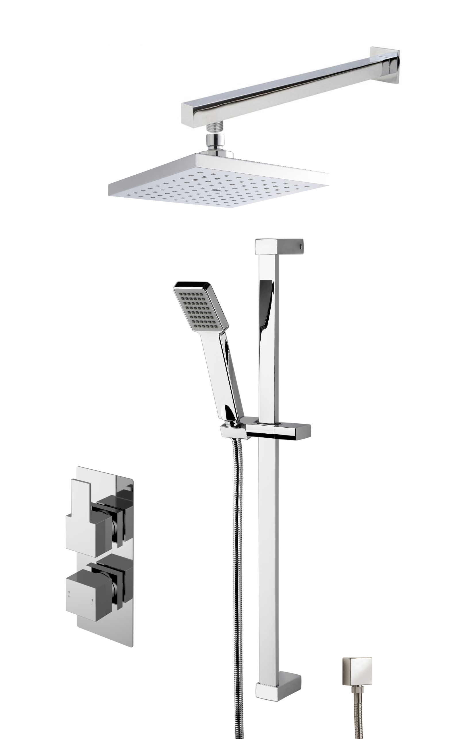 nuie Sanford Thermostatic Concealed Twin Square Valve with Diverter with Single Function Handset & Outlet Elbow Wall Mount Shower Arm & Square Fixed Head Shower Kit - Chrome