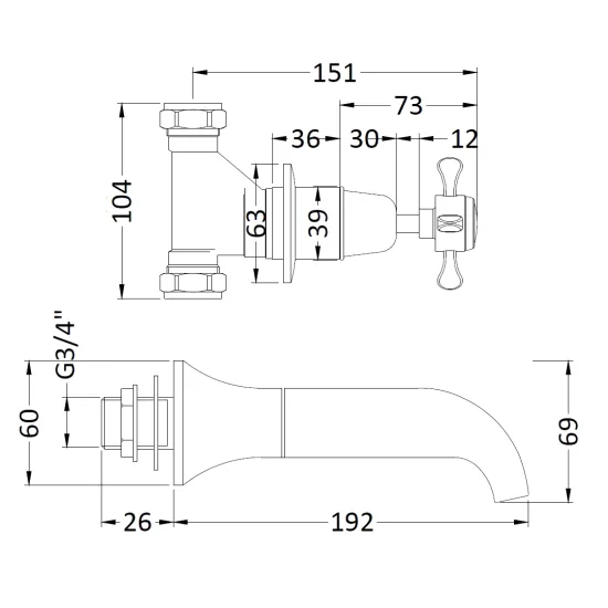 White Topaz With Crosshead Handle Wall Mounted Bath Spout & Stop Taps