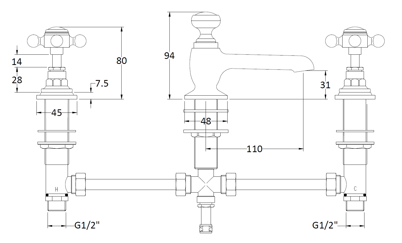 Victrion Deck Mounted Crosshead 3 Tap Hole Basin Mixer Tap