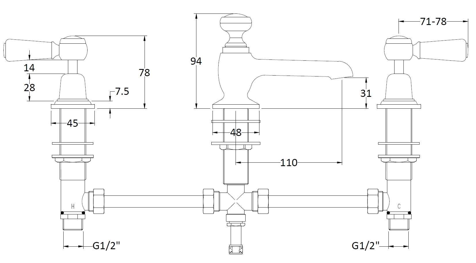Victrion Deck Mounted Lever 3 Tap Hole Basin Mixer Tap